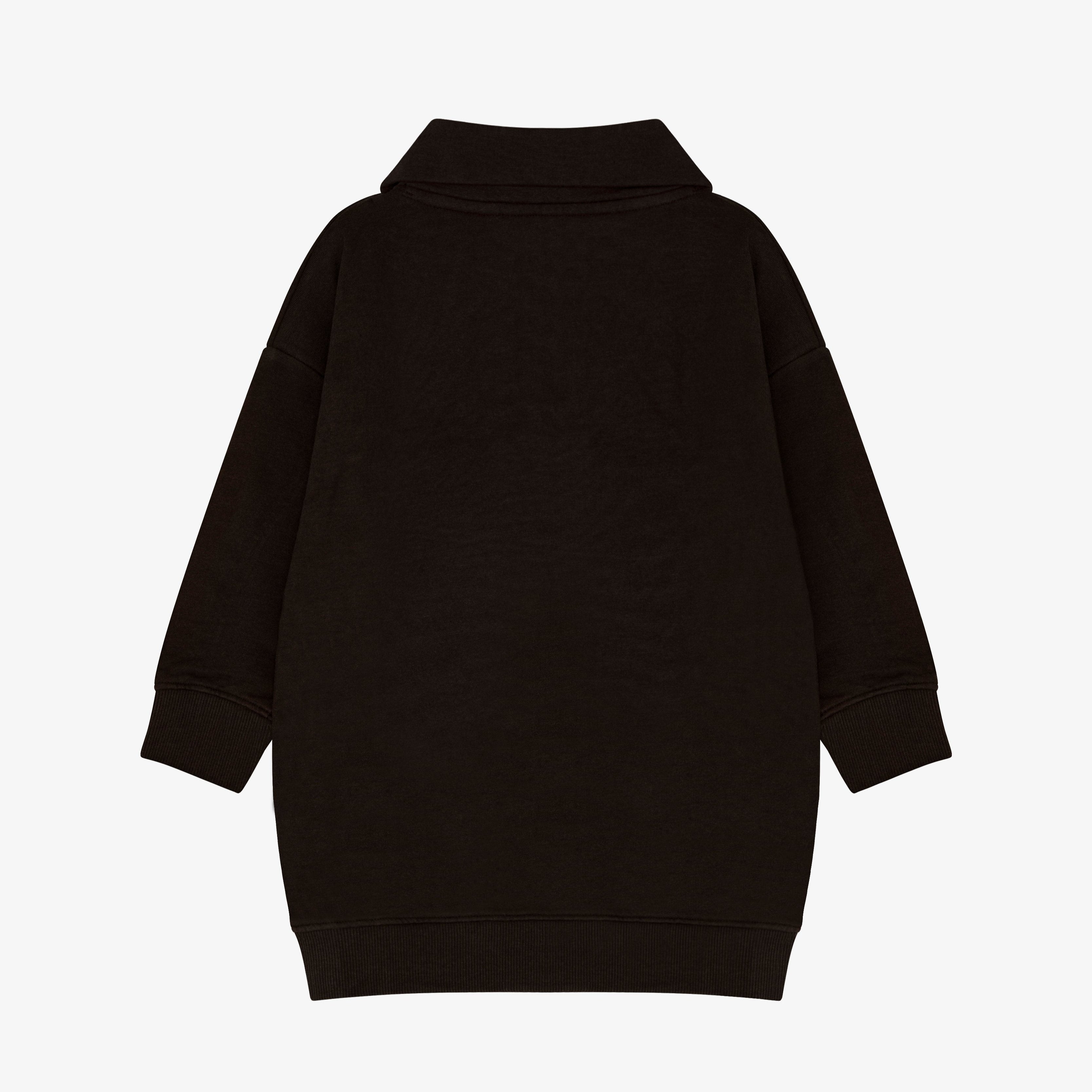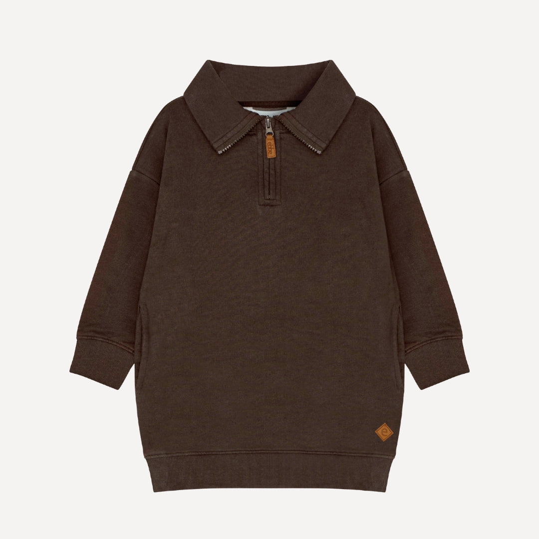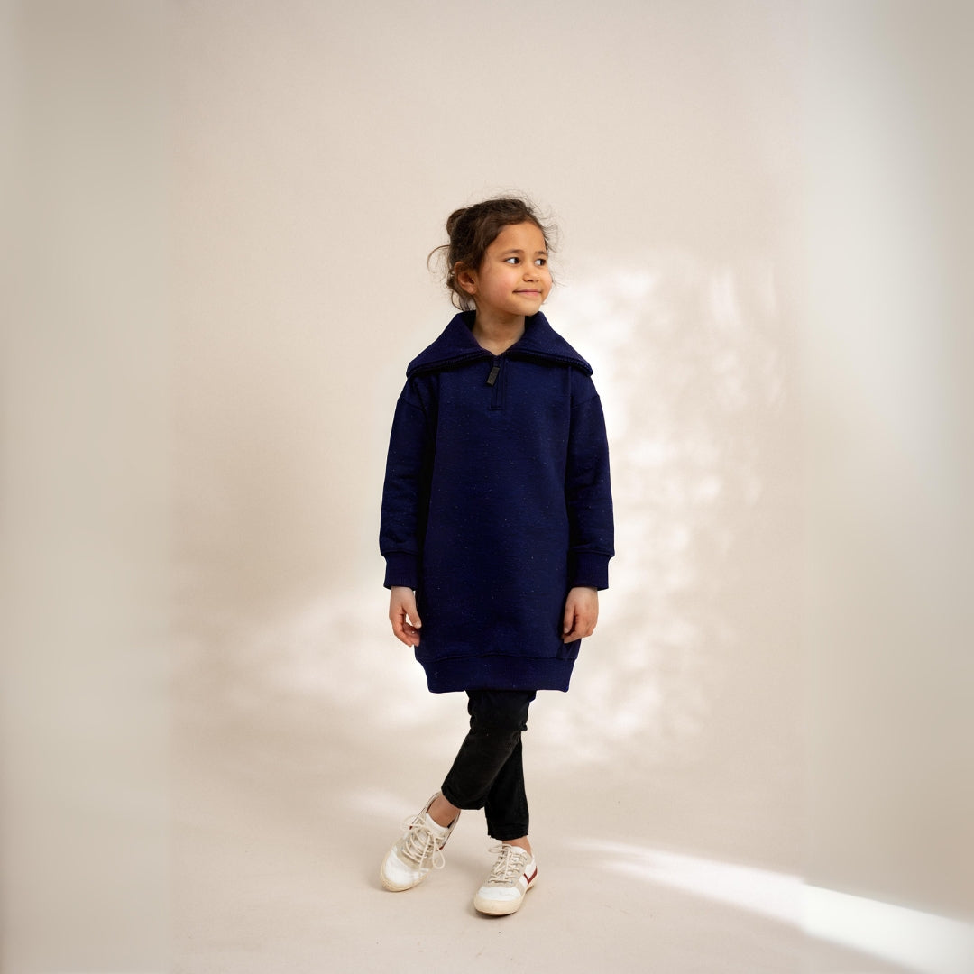 Mysig sweatshirt-klänning i avslappnad passform och stilren design. Klänningen har en halvlång dragkedja framtill samt en klassisk krage för en extra touch av elegans. Ribbstickade muddar i ärmslut och nederkant ger en bekväm och följsam känsla. Tillverkad i mjuk ekologisk bomull som är både hållbar och skön mot huden. Perfekt för både lek och vardag.