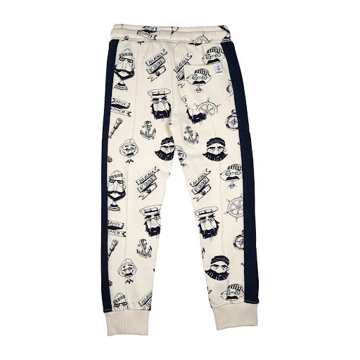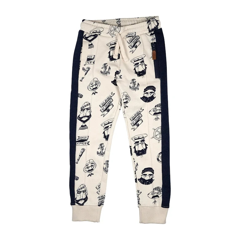Lång byxa till barn i mjuk sweatshirt kvalitet med fint handritat tryck med lekfulla karaktärer hämtade från de sju haven – alla med sin egen historia att berätta. Bred resår i midjan med dragsko för enkel påklädning och justerbar midja. Enfärgade revärer för en snygg look. Fickor i sidsöm och ebbes signaturficka bak.