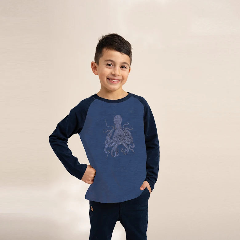 Långärmad raglantröja för barn i mjuk jersey gjord av en mix av bomull och ekologisk bomull. Tröjan har en rak passform och finns i flera olika färger och tryck. Tröjan ingår i vårt hållberhetsconcept Rescue Collection. Kort sammanfattat kan det beskrivas som ett etiskt förhållningssätt till mode med fokus på att eliminera tygsvinn och värna om de människor som tillverkar kläderna.