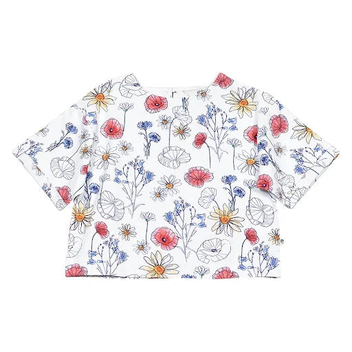 Topp i bekväm lite breade och kortare passform med uppvikt ärmkant och titthålsöppning bak i nacken. Toppen har ett handritat print framtaget av vår designer med vackra blommor målade i akvarell på vit bakgrund. Hållbart tillverkad av ekologisk bomull.