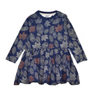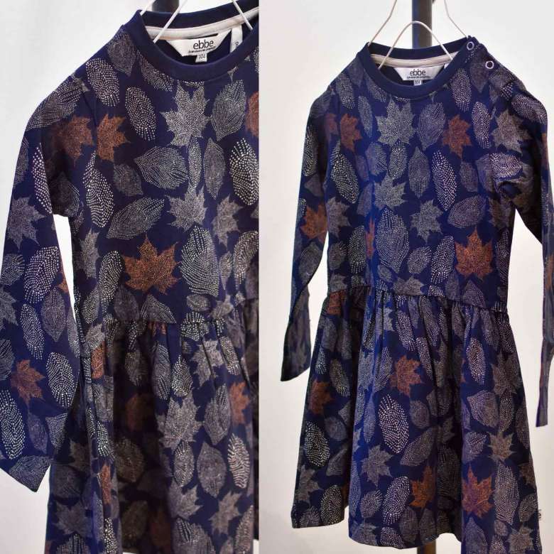 Långärmad klänning till barn i mörkblå färg med lövmönster, med skärning i midja och mycket vidd i kjoldelen.