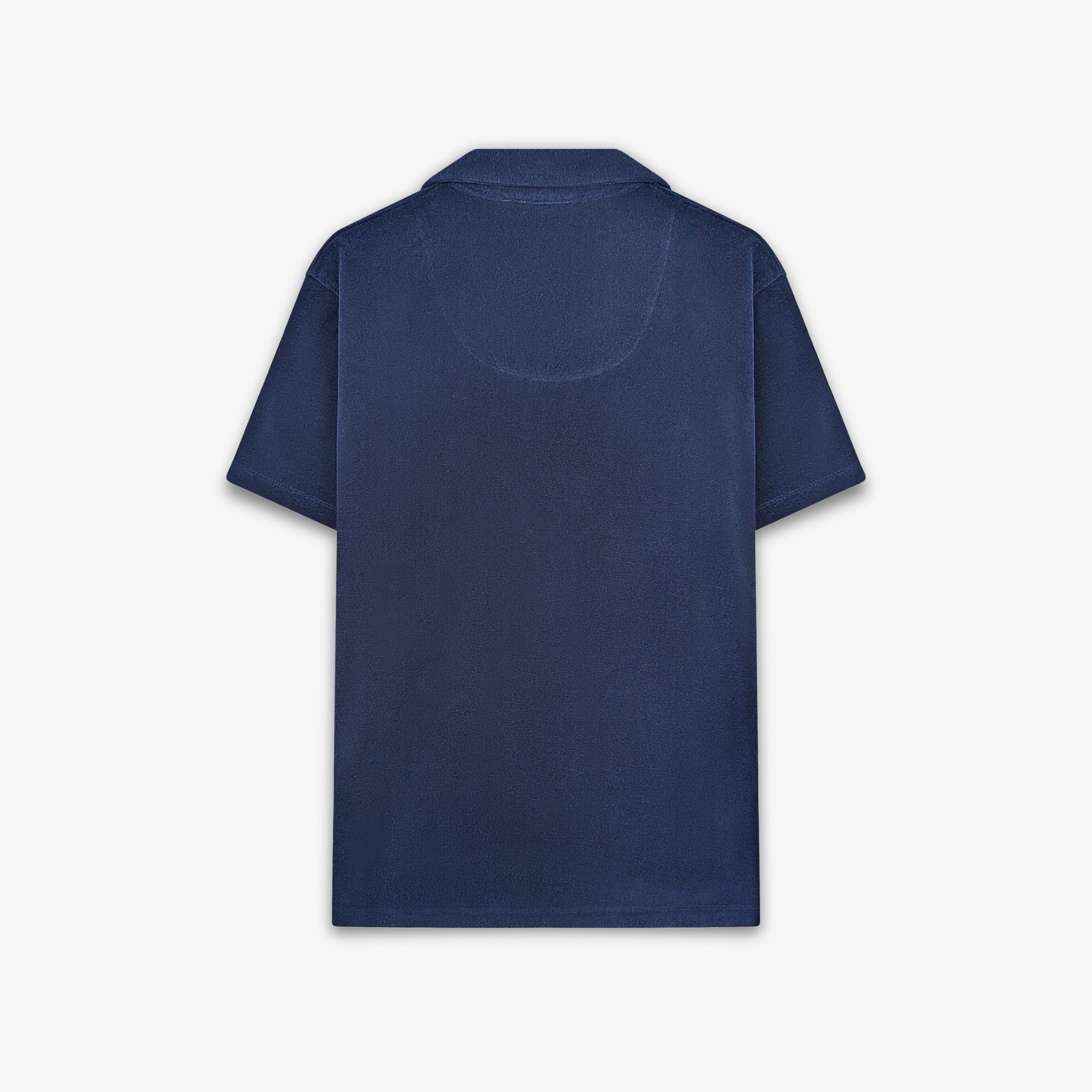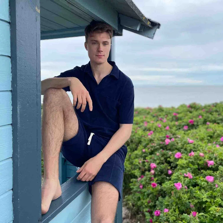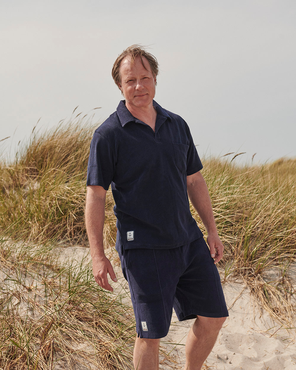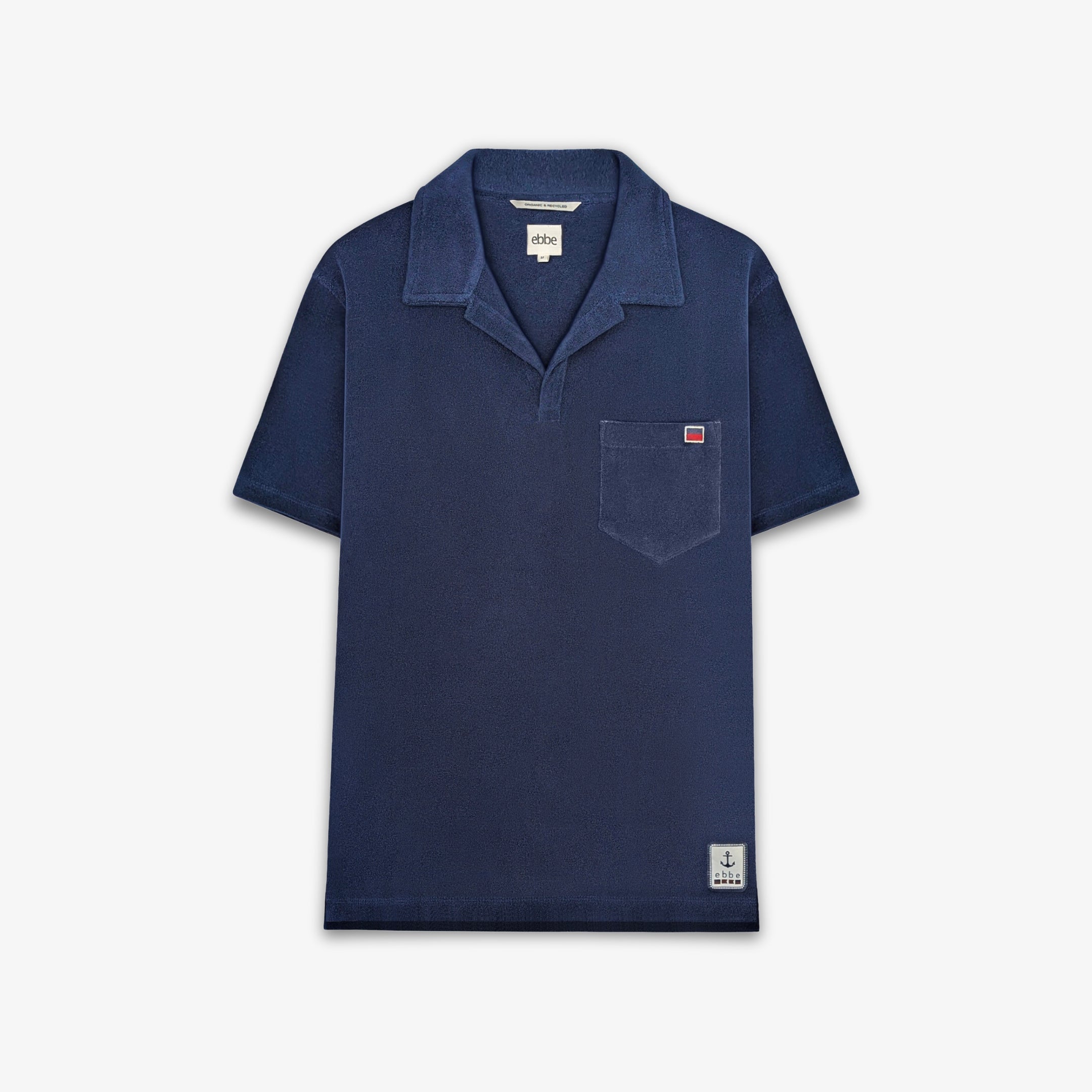 Kortärmad mjuk Terry skjorta i bomull med en snygg krage. En ficka på bröstet med ett broderad signalflagga för bokstaven "e - som i ebbe". Bomullstyget är gjort av samma material som våra populära badrockar i Terry / Frotté. Tyget är väldigt skönt och luftigt mot huden.