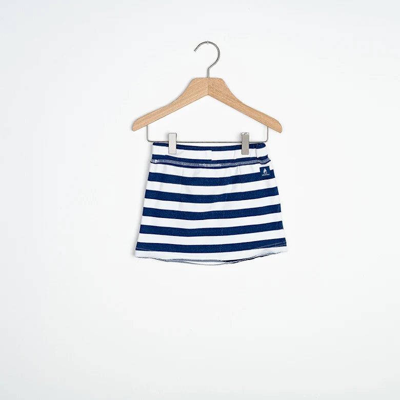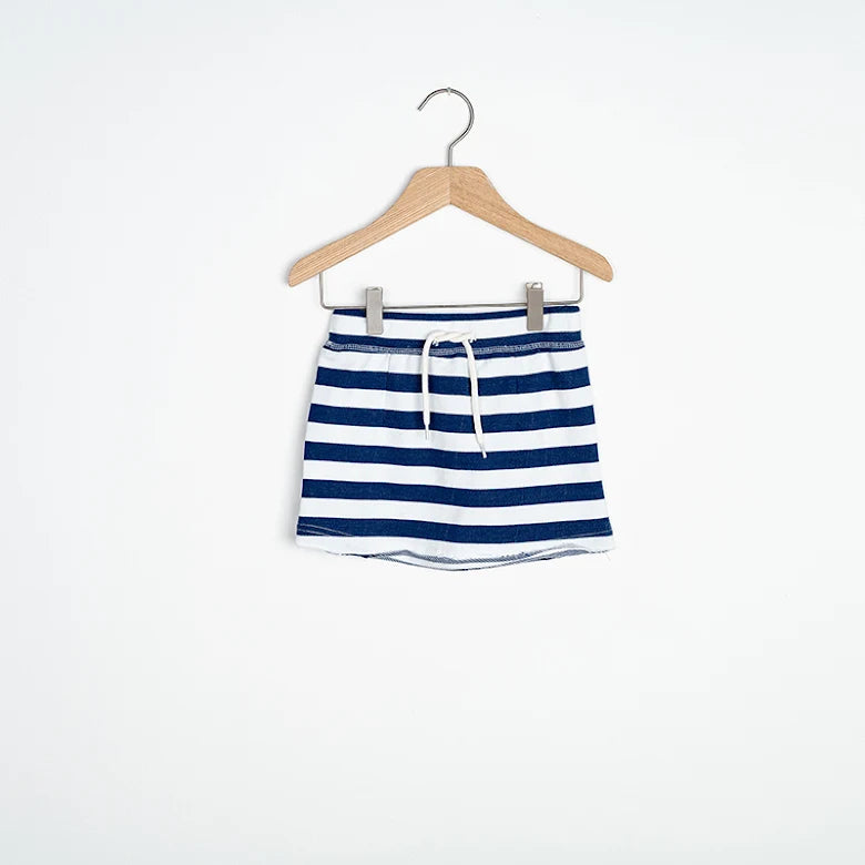 Sportig kjol i blåvit rand. Mjuk resår i midjan och flätat band. Tillverkad i mjuk sweatshirtkvalitet i ekologisk bomull.