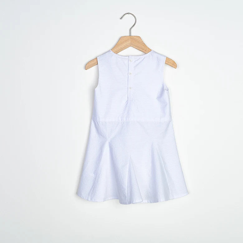 Sommarfin ärmlös klänning med kilar nertill för extra vidd. Knappslå med knappar bak. Tillverkad i vävt tyg.