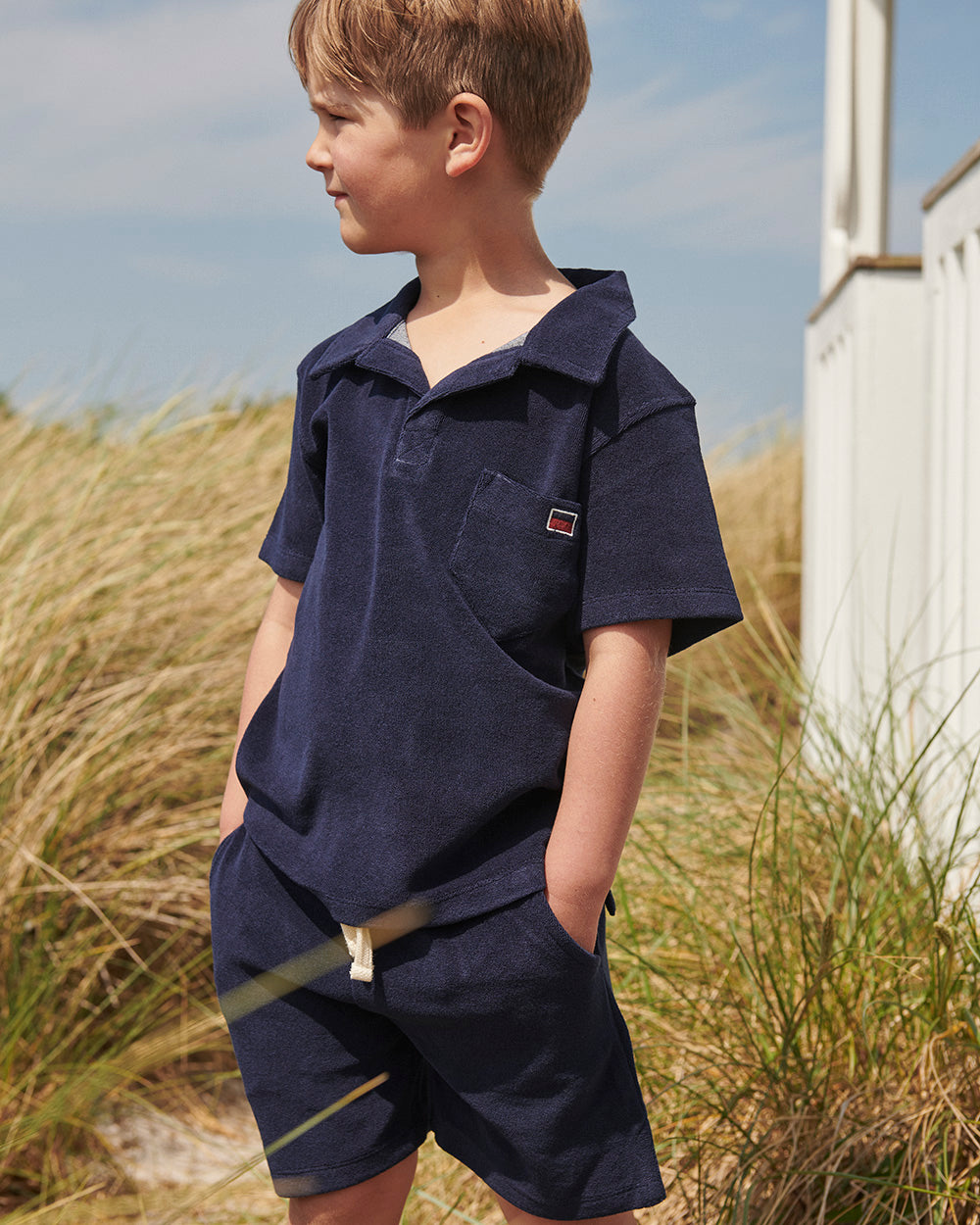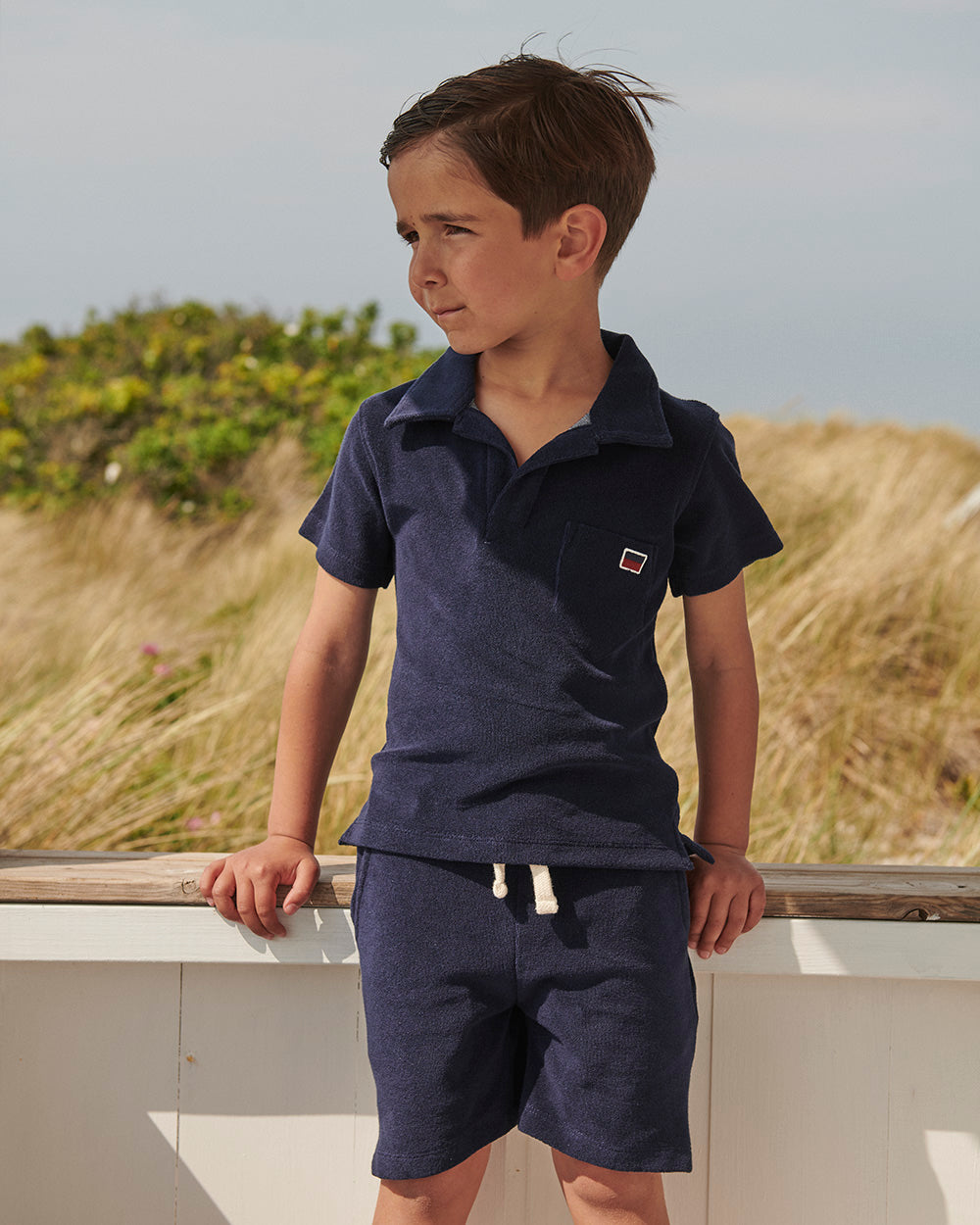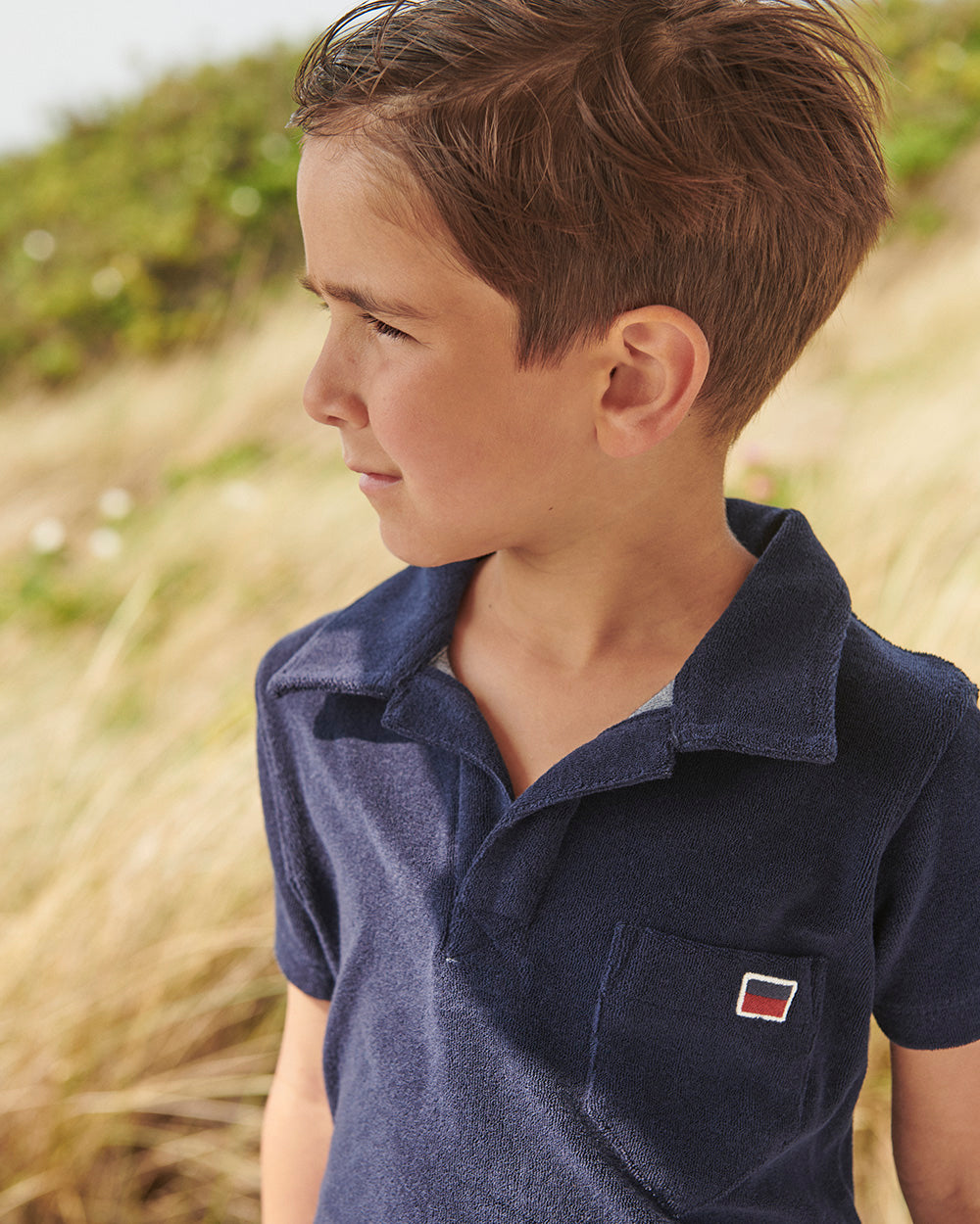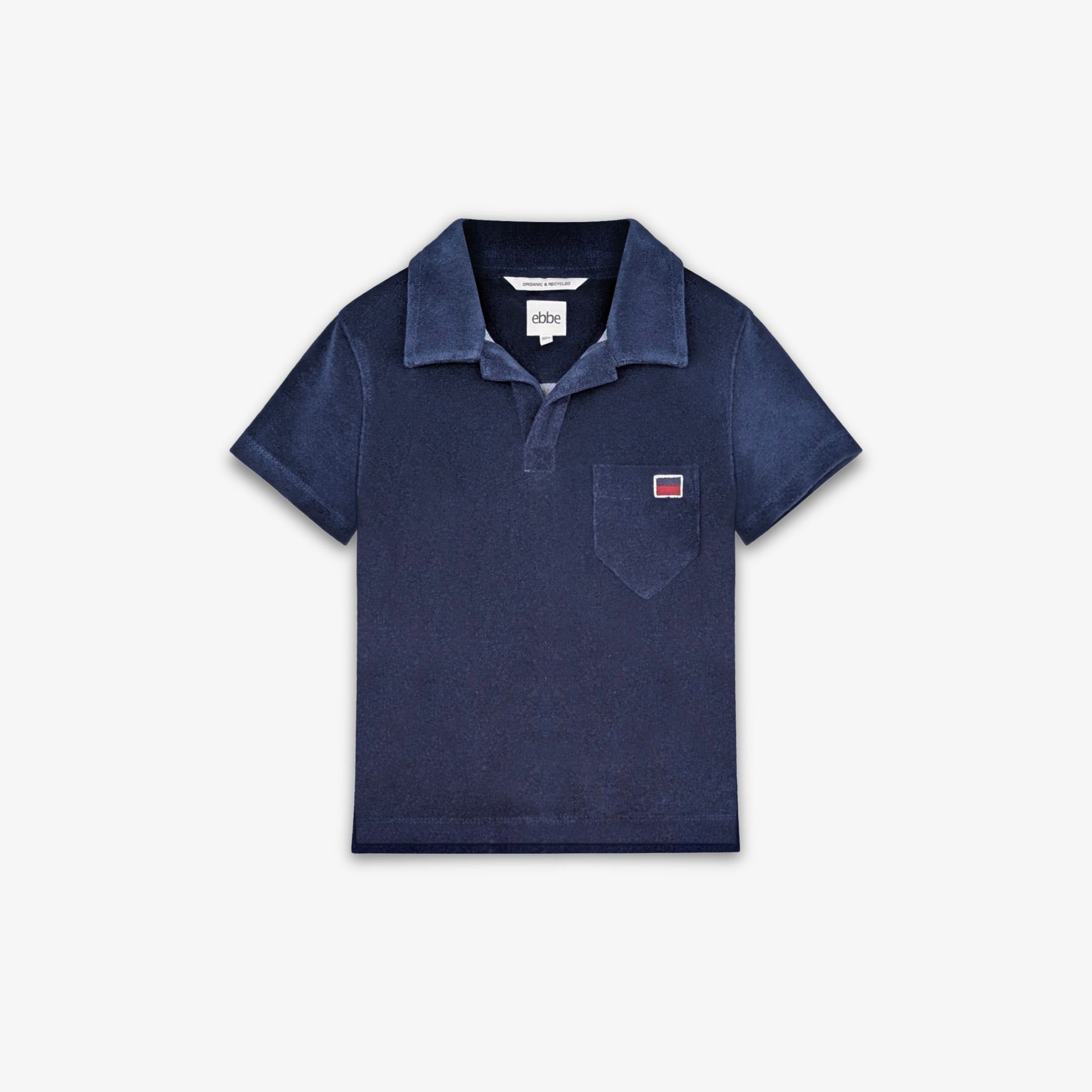 Kortärmad mjuk Polo skjorta i frotté med en snygg krage. En ficka på bröstet med en broderad signalflagga för bokstaven "e - som i ebbe". Den har samma härliga kvalitet som våra populära badrockar.